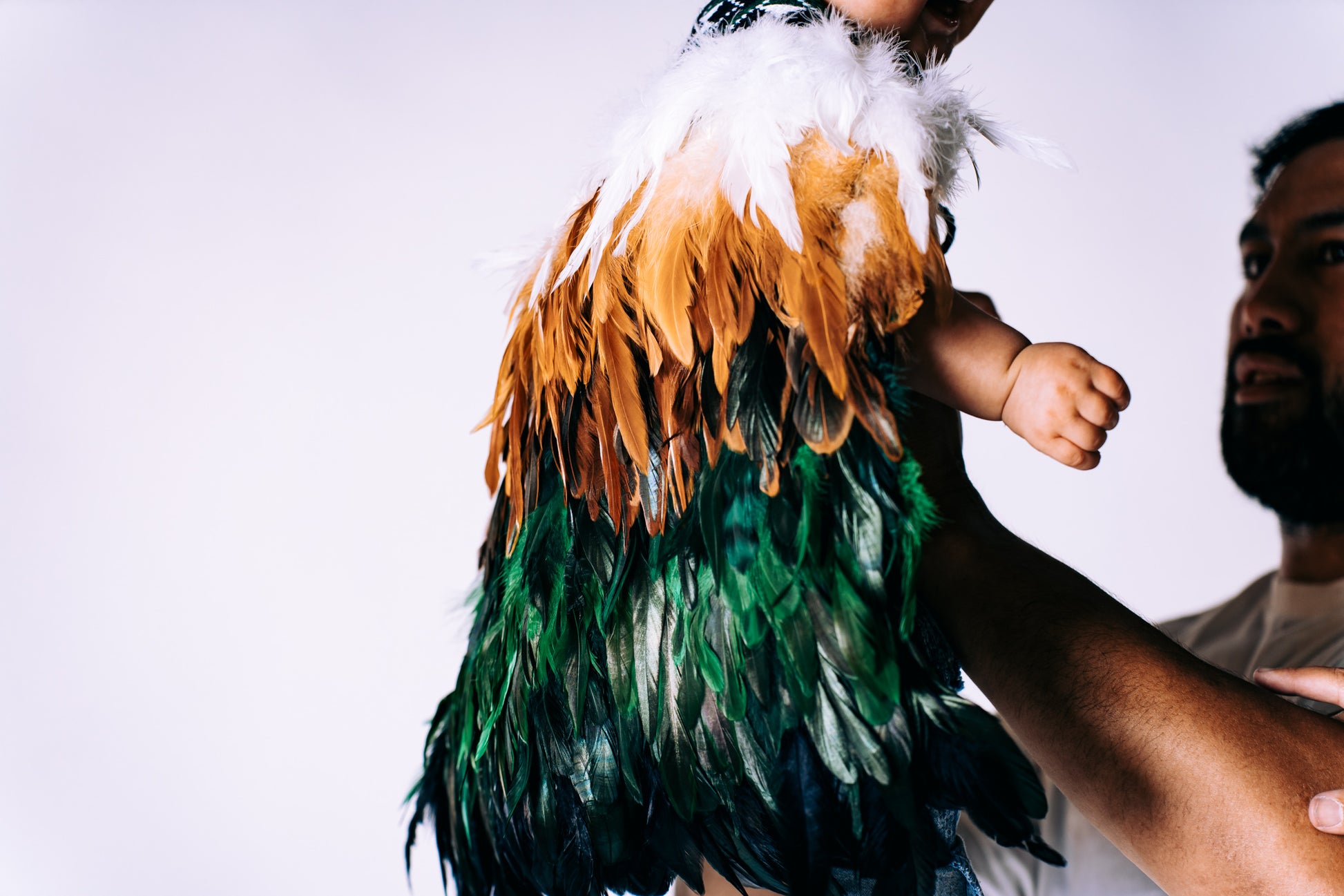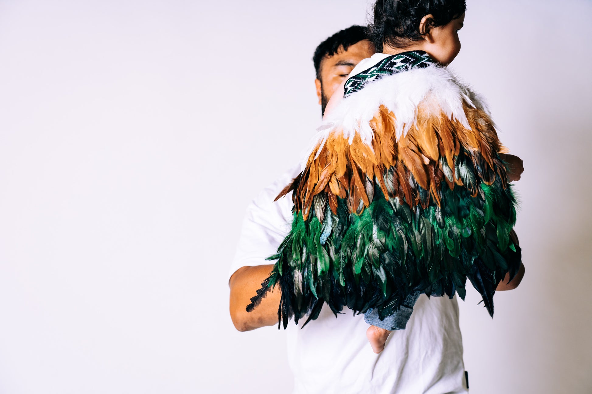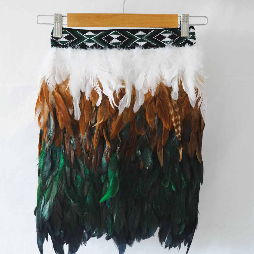 A baby korowai featuring lush green feathers blended into tan brown, finished with a single layer of white at the top.