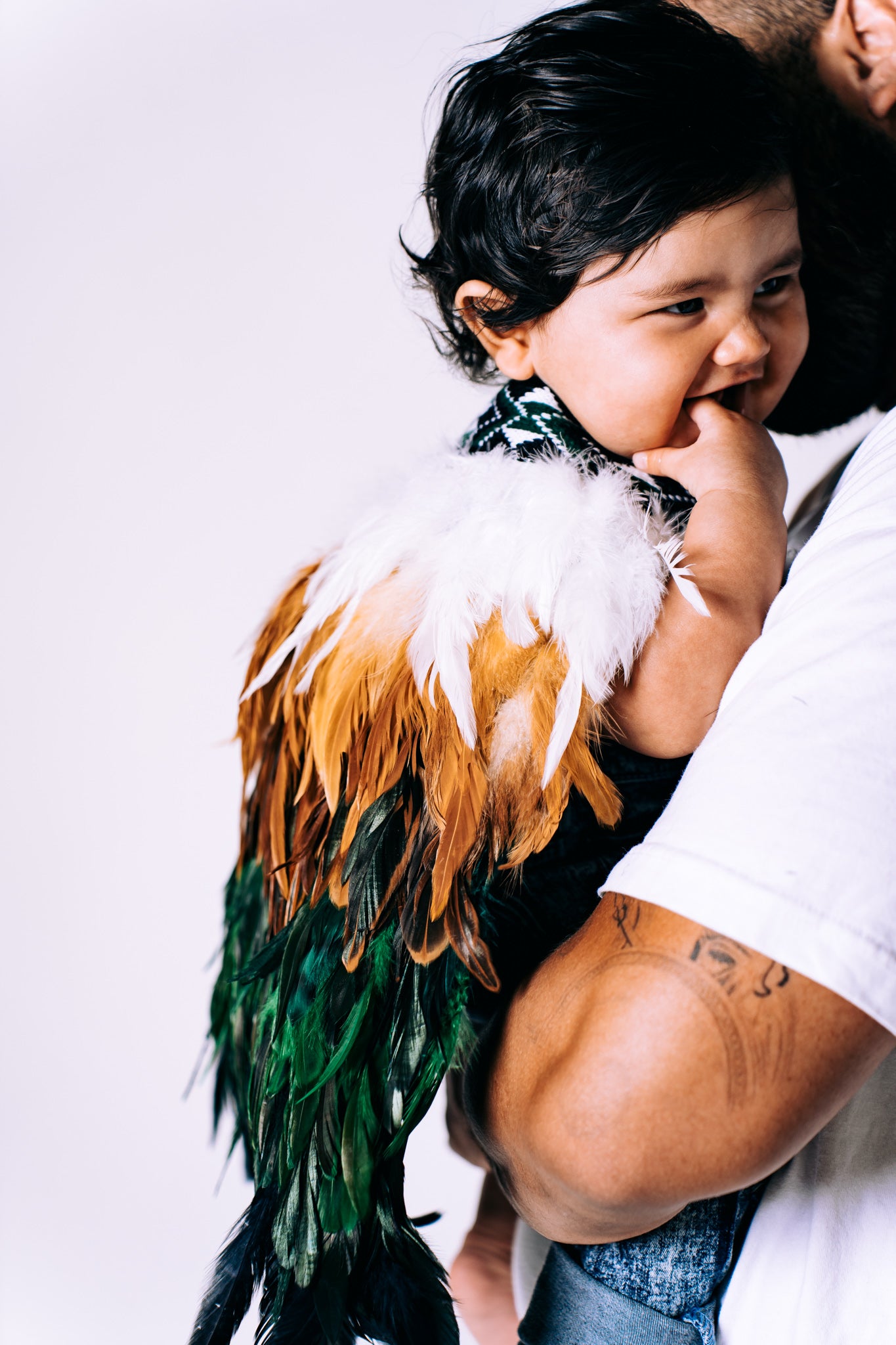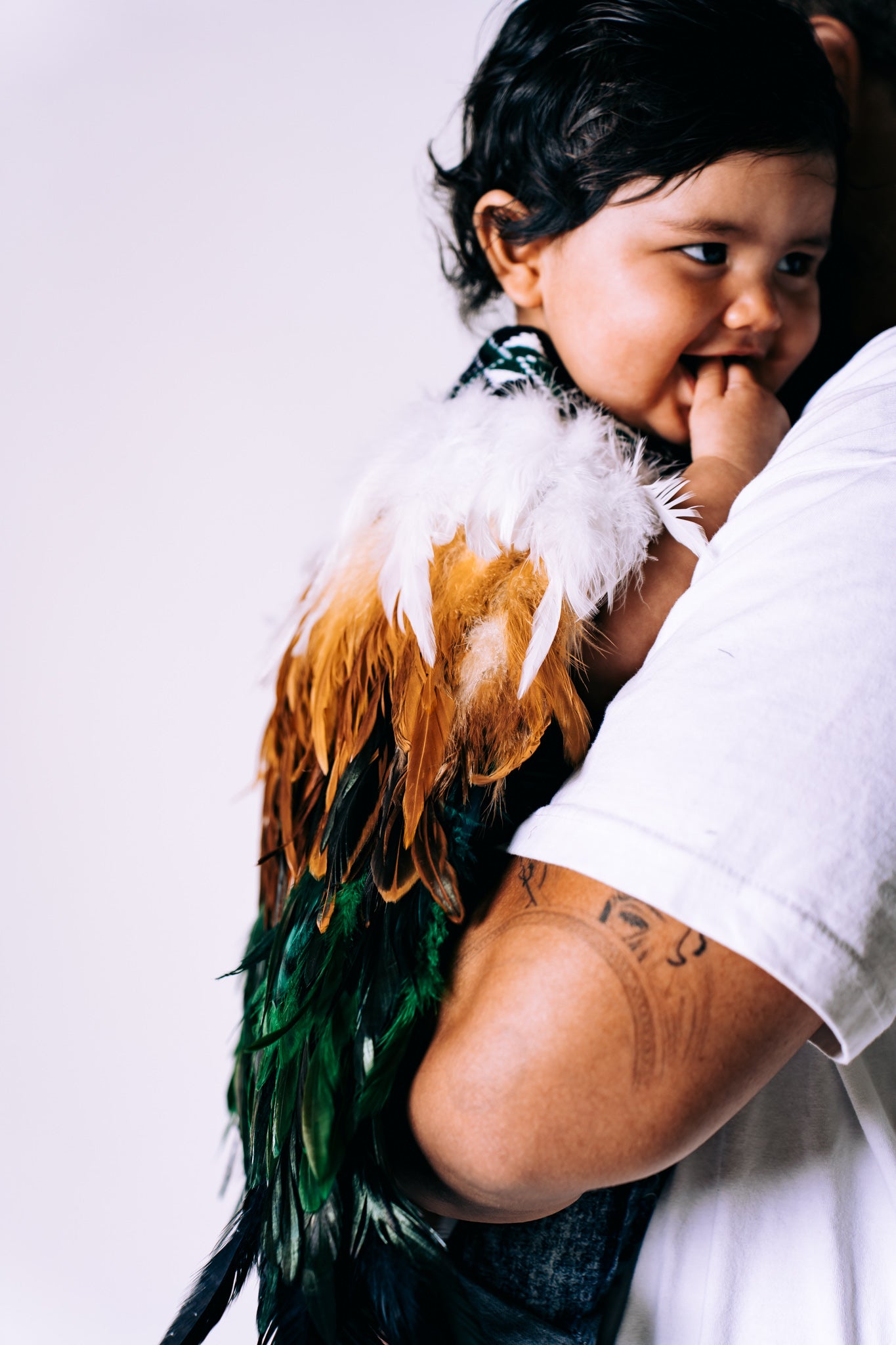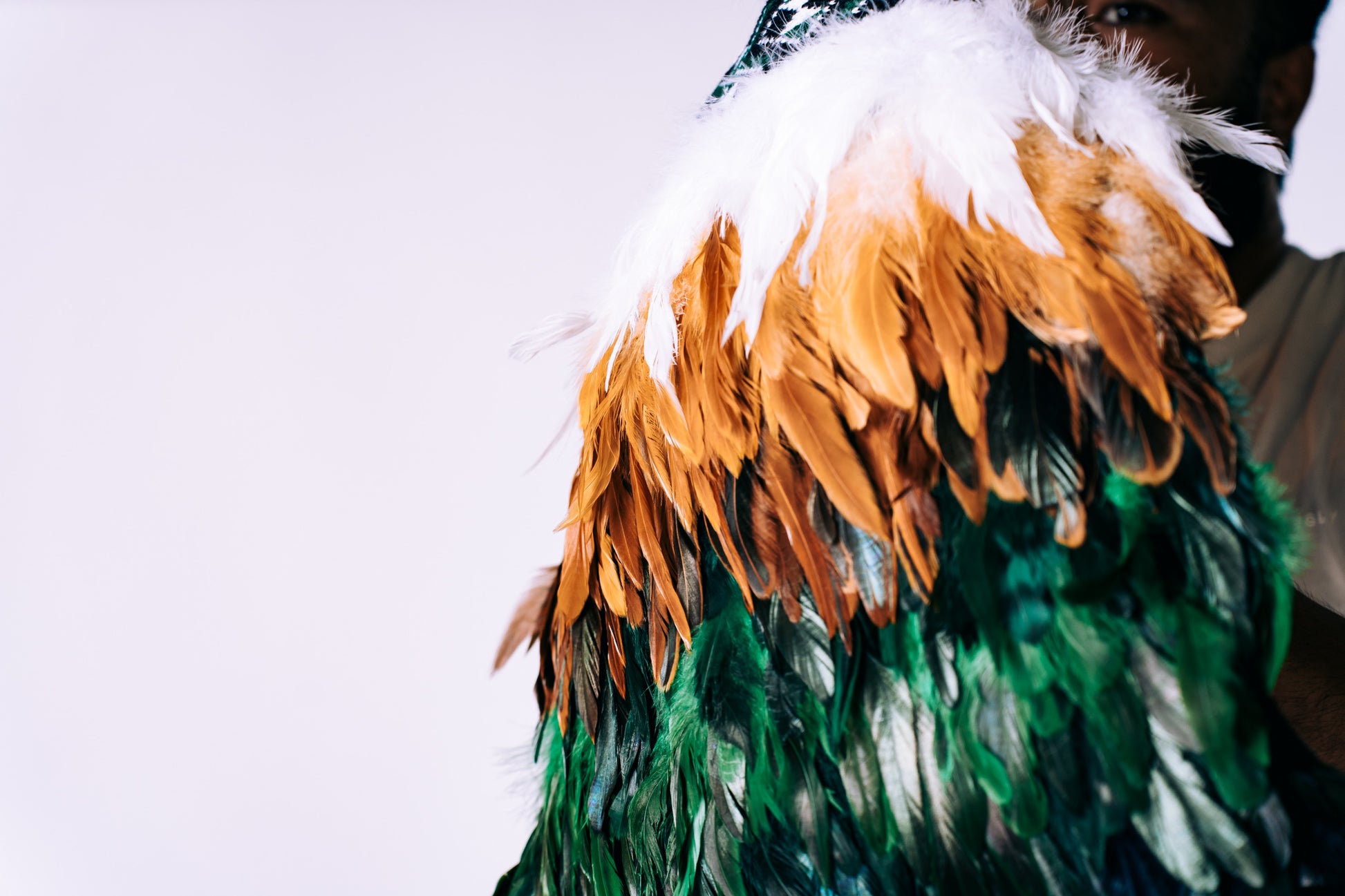 A baby korowai featuring lush green feathers blended into tan brown, finished with a single layer of white at the top.