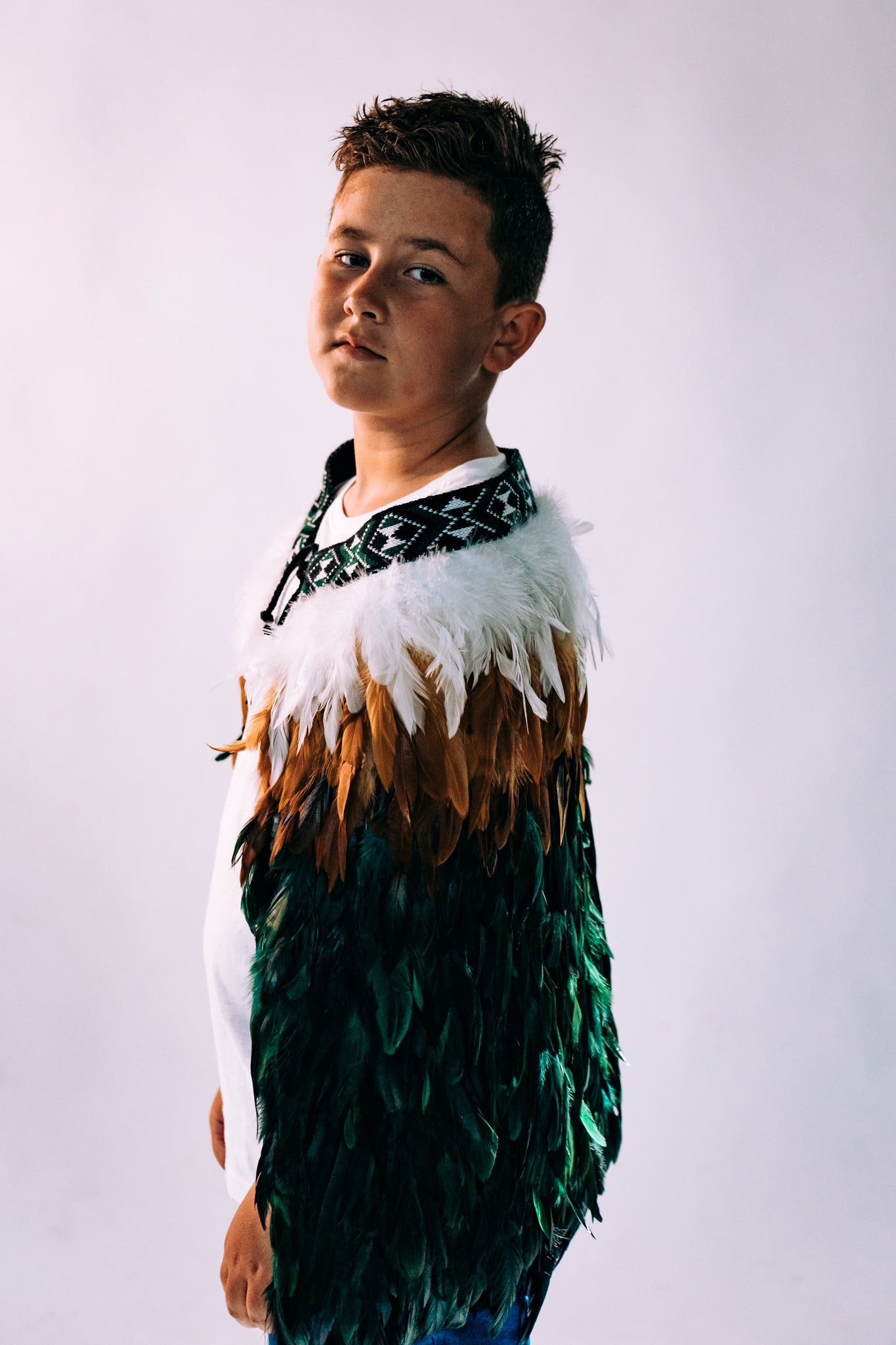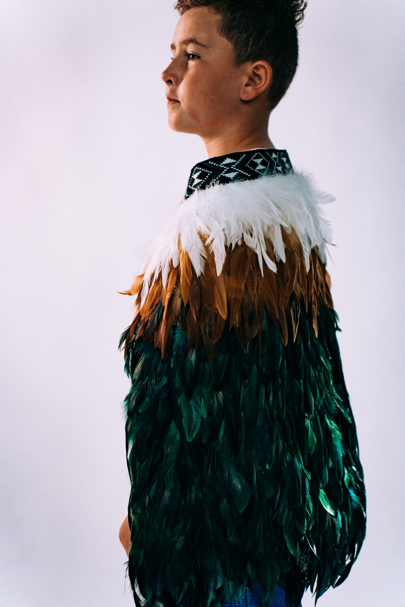- A children’s korowai in vibrant shades of green, symbolising the life force of the forest and its deep connection to nature.