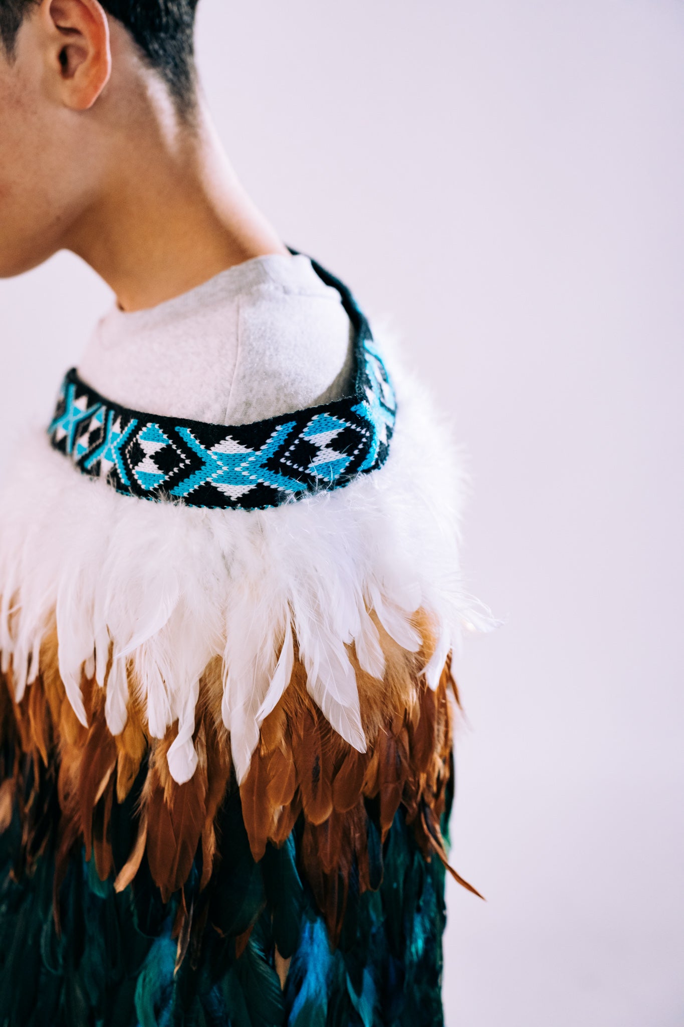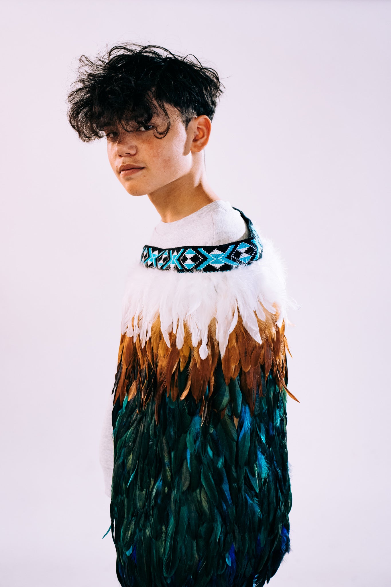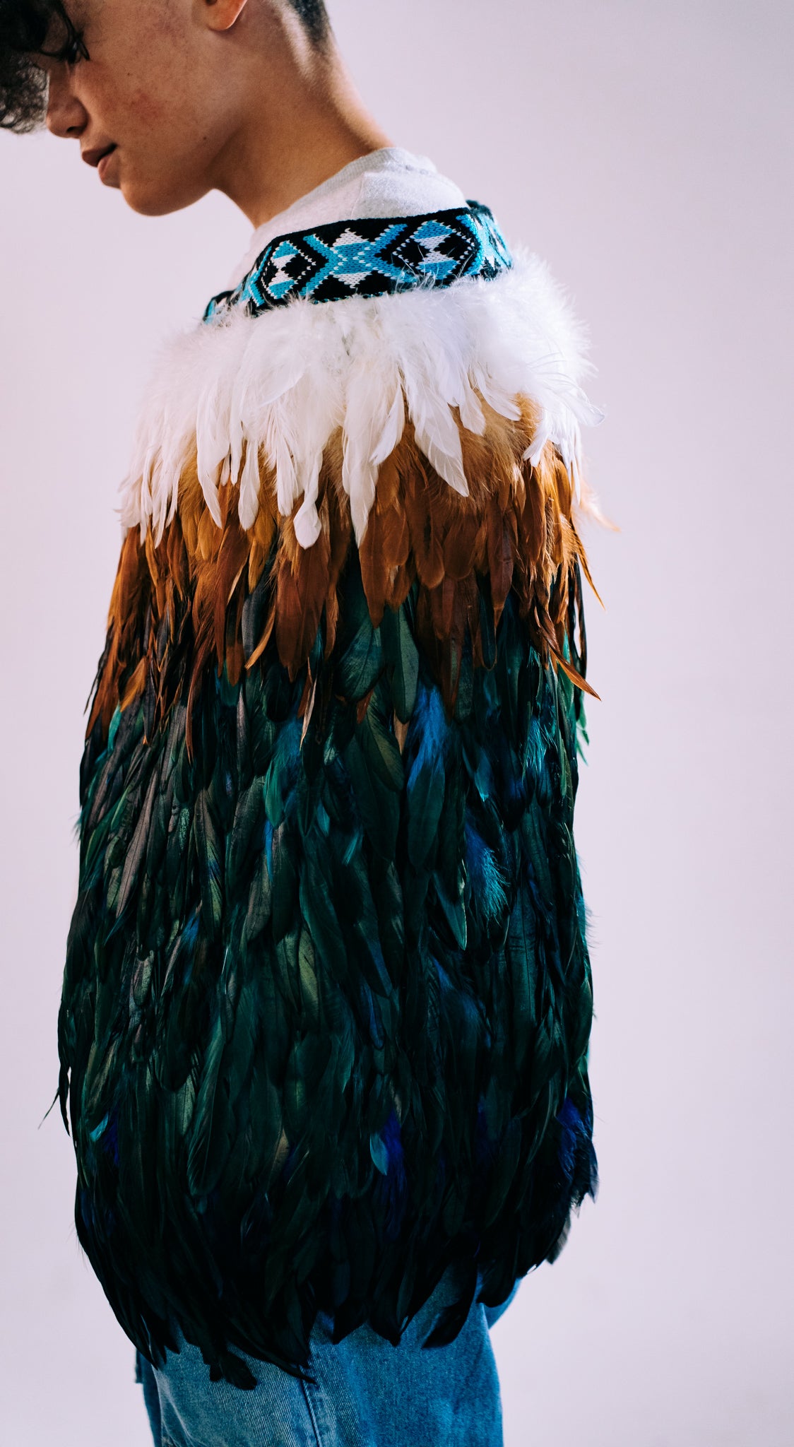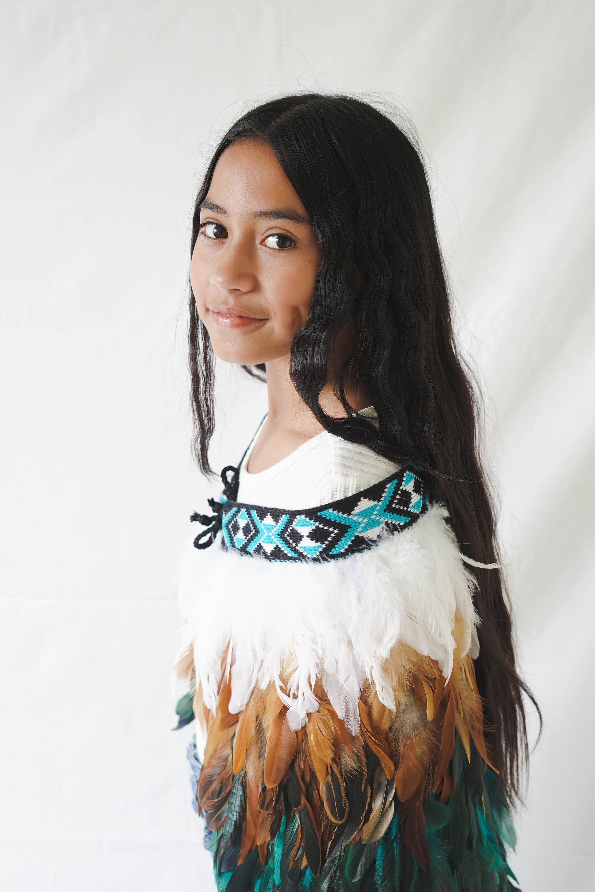 • A children’s korowai designed in vibrant royal blue, turquoise, natural browns, and white feathers, symbolising protection and connection to loved ones.