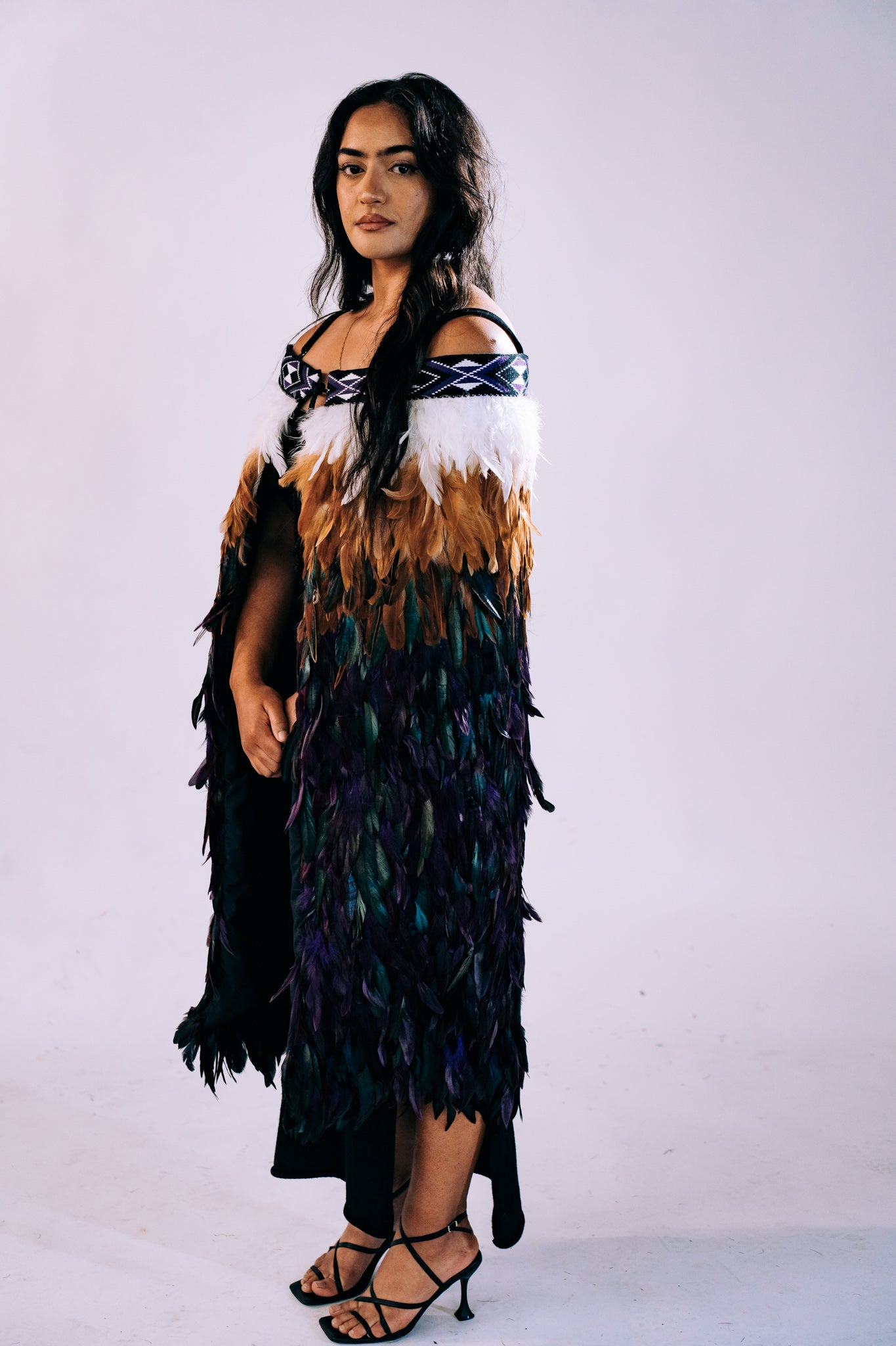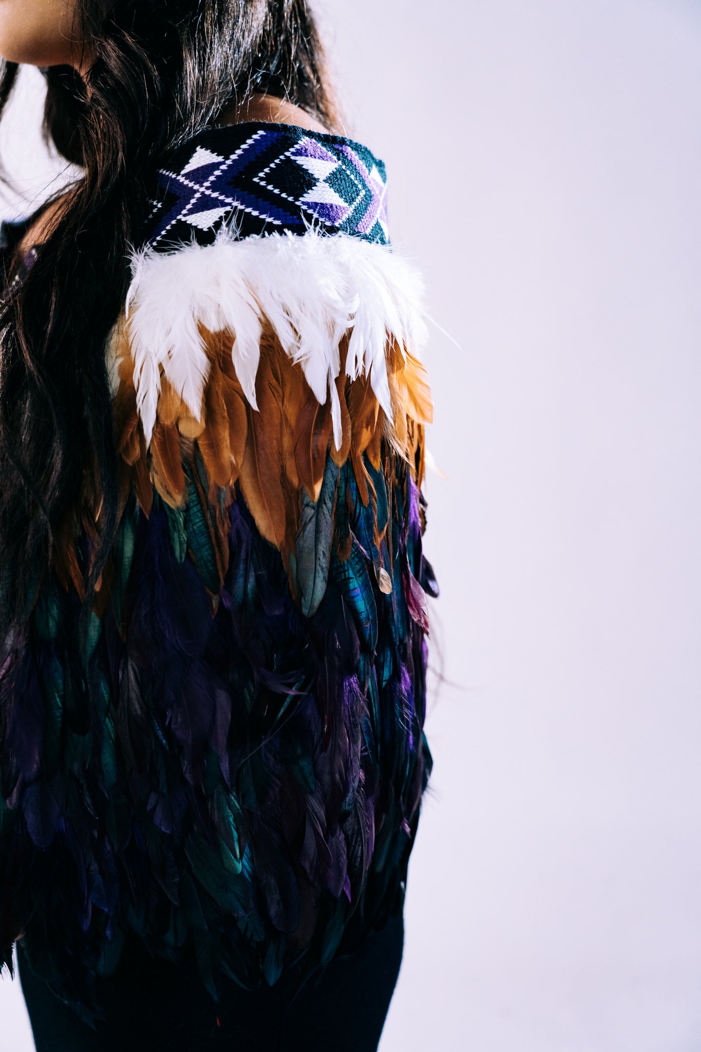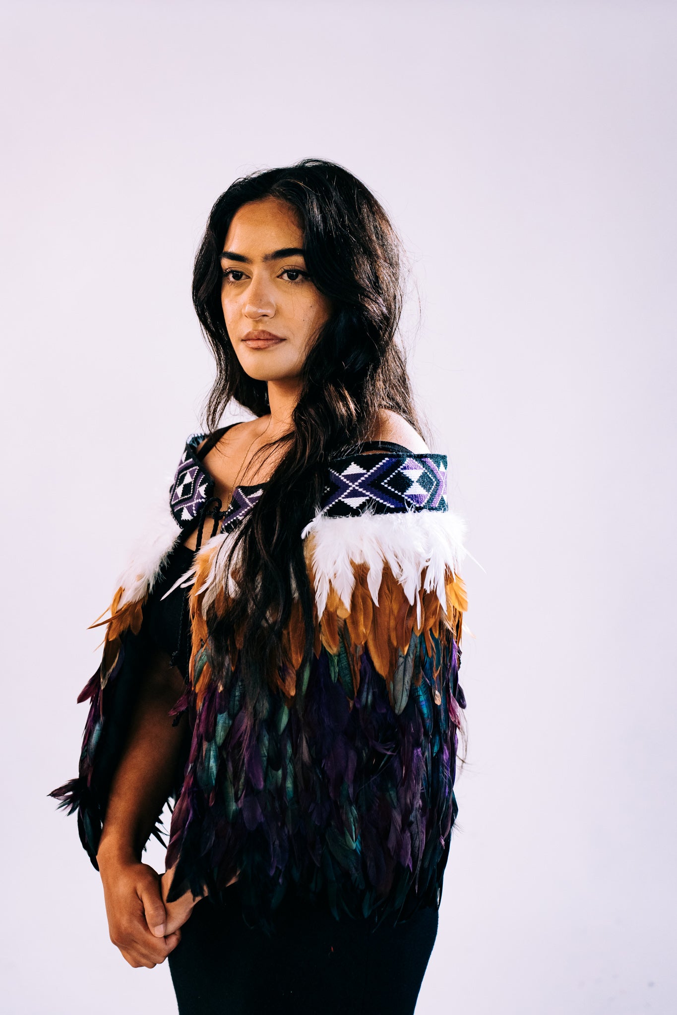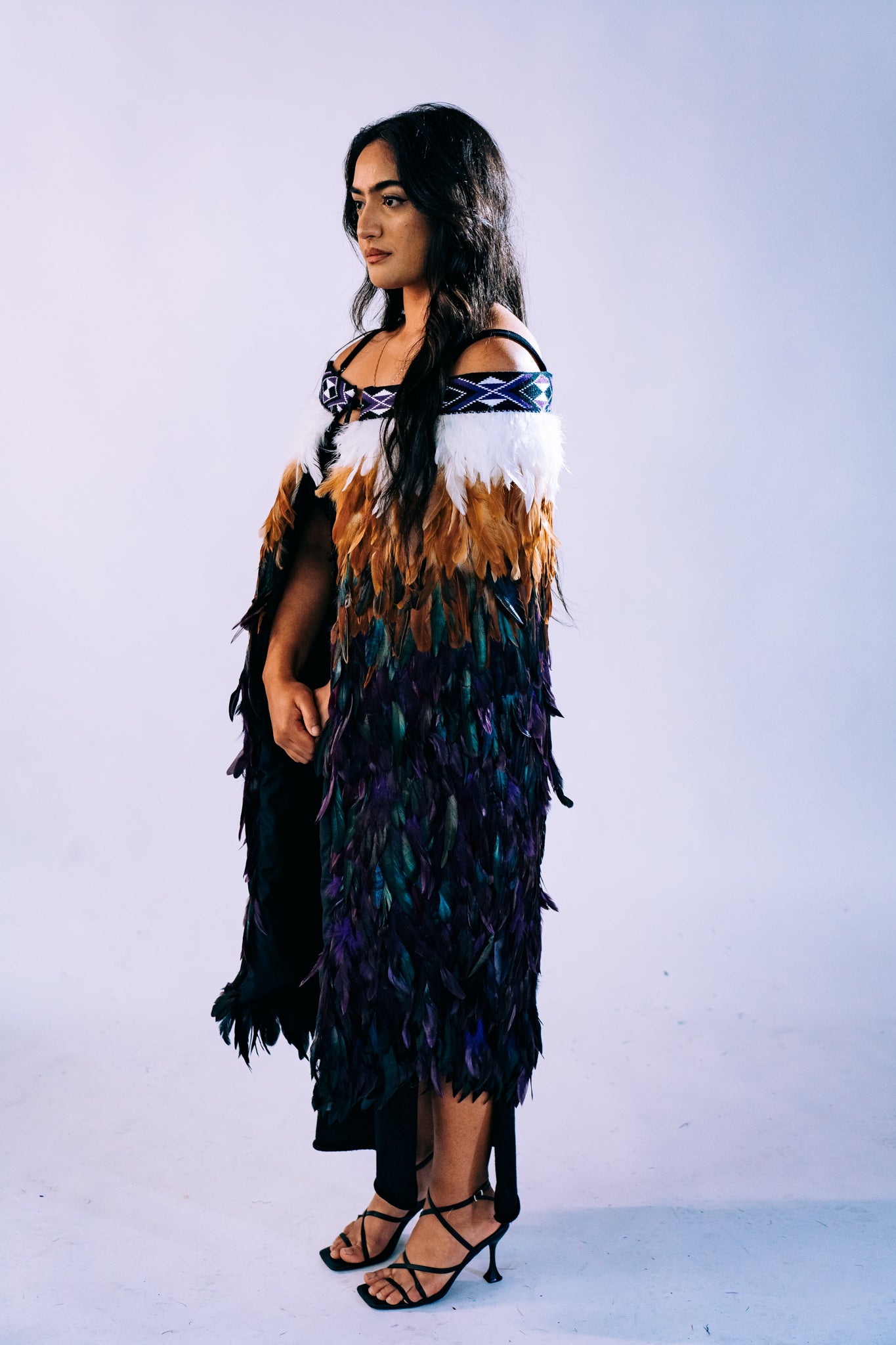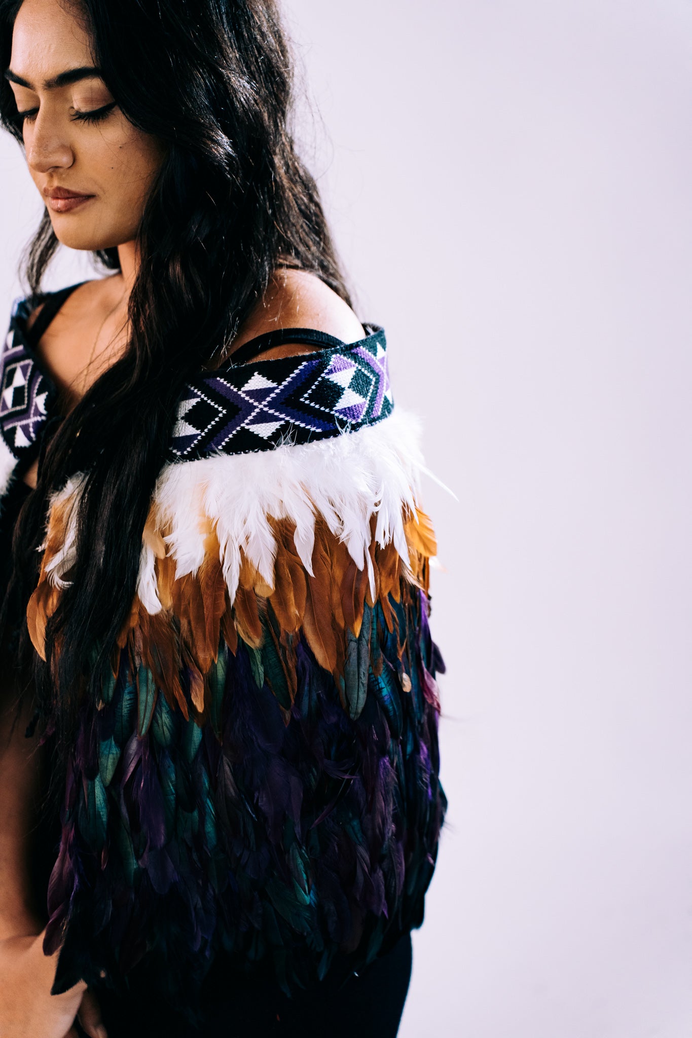 - This piece features a mix of royal purple, black, and white taniko bands. Deep purple hues combined with vibrant aubergine and natural brown feathers harmonize with the white feathers at the top, resulting in a visually captivating and comfortable design.