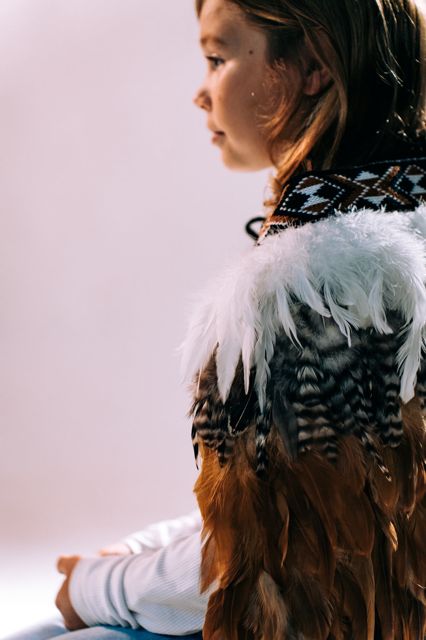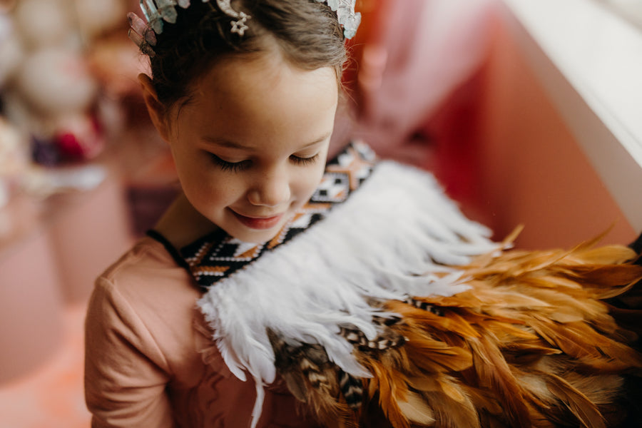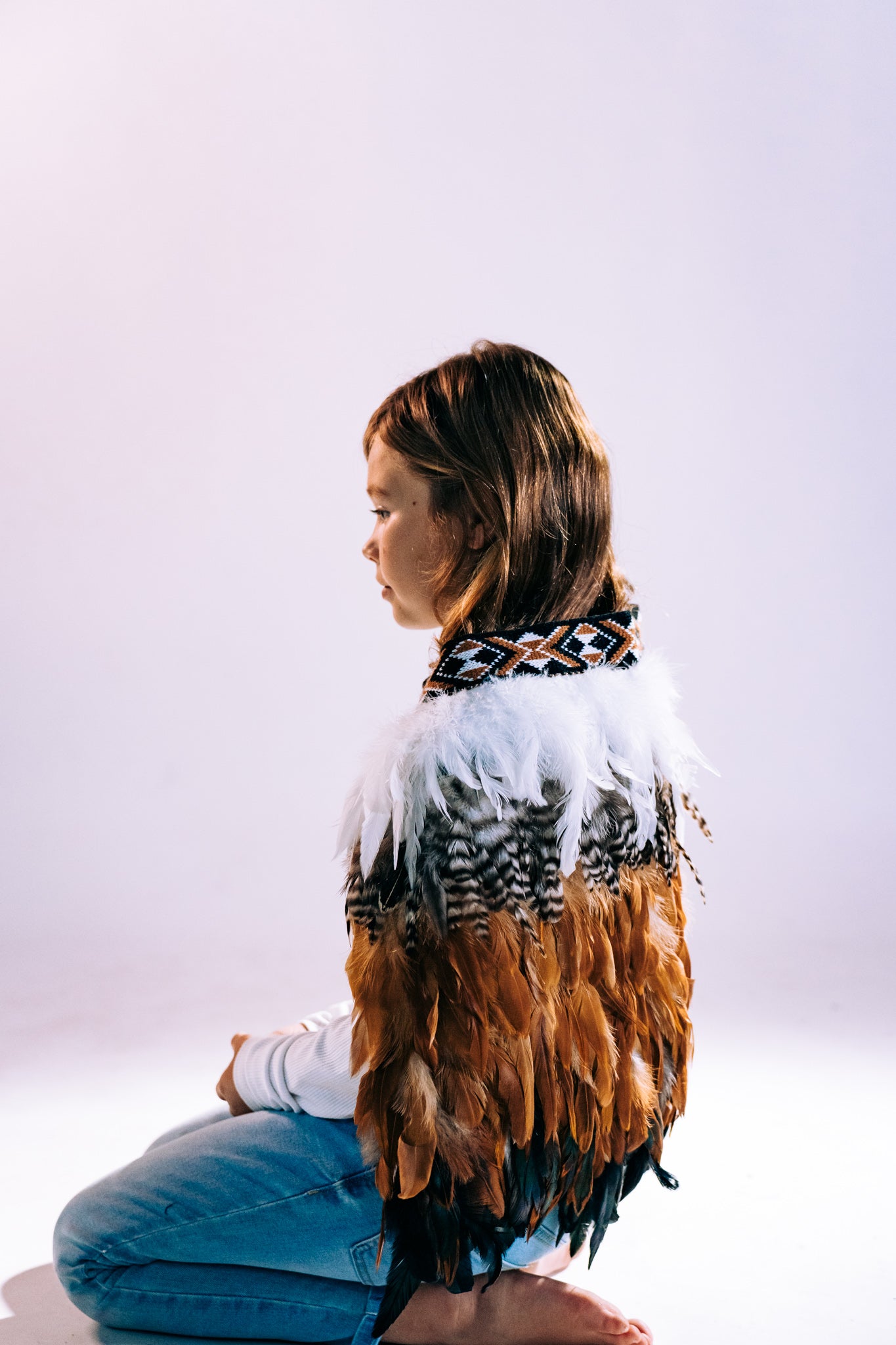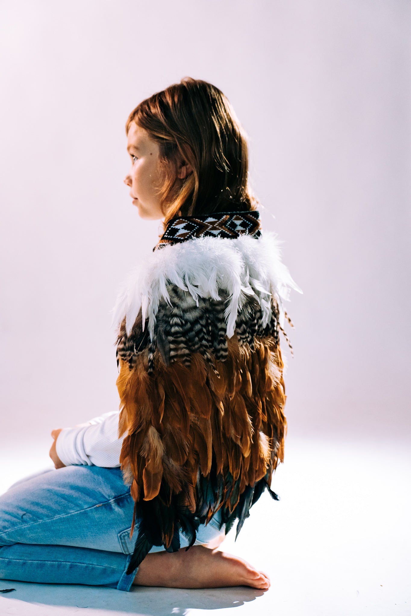 - A toddler korowai crafted with warm earthy brown feathers, accented with subtle green and black highlights.