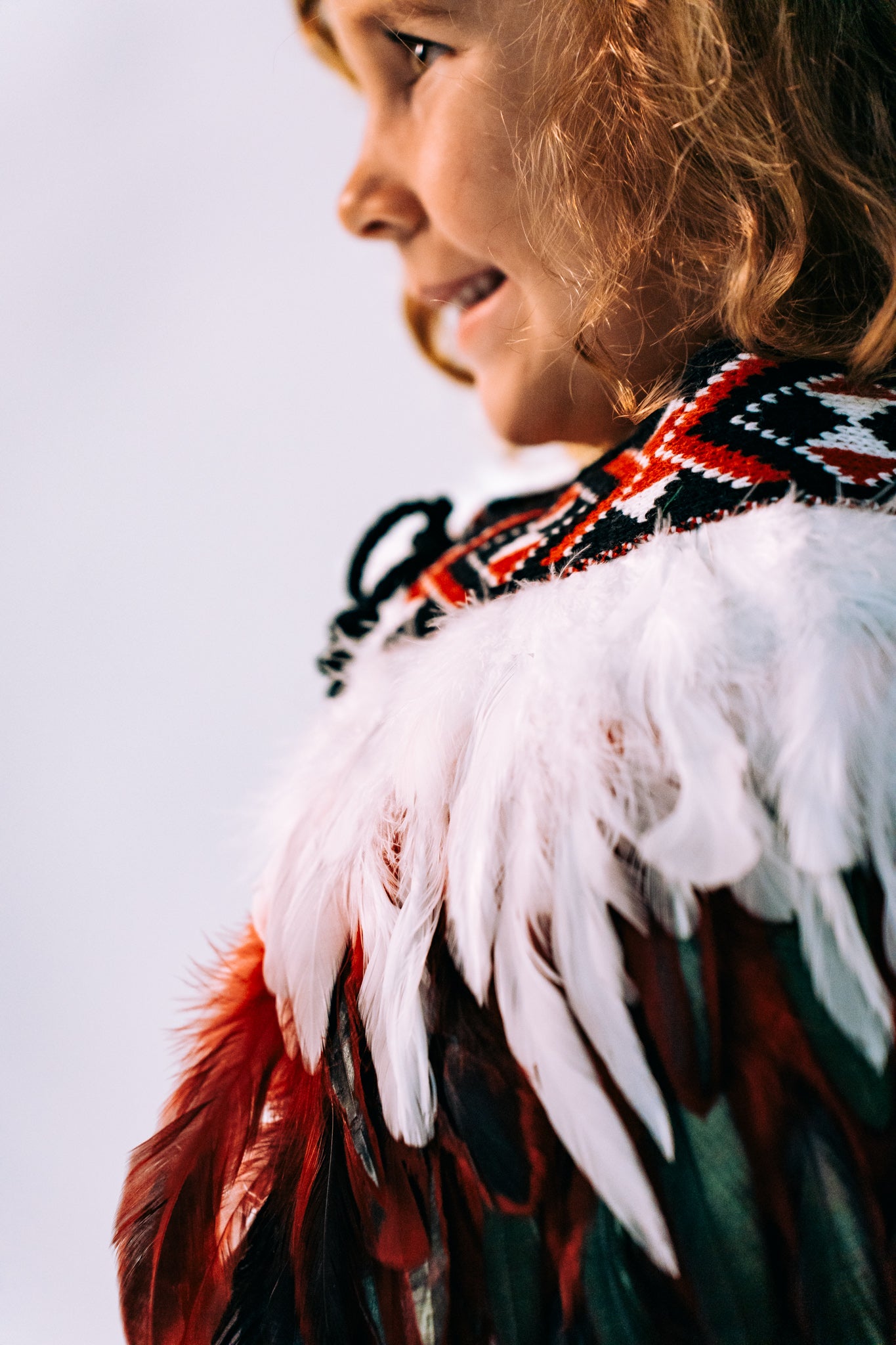 - A vibrant baby korowai symbolising strength, courage, and identity.