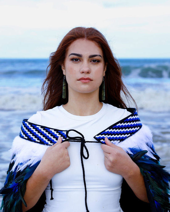 - Showcasing a blend of royal blue, black, and white taniko band. Royal blue and turquoise feathers complement the white feathers positioned at the top, creating a striking and comfortable design.