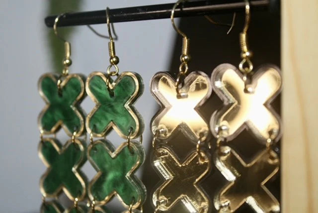 Inspired by traditional tuku-tuku panel stitches. Contemporary, elegant, and lightweight. Available in Pango, Pounamu, and Paua. Designed by Māori artists and lasercut in Aotearoa.